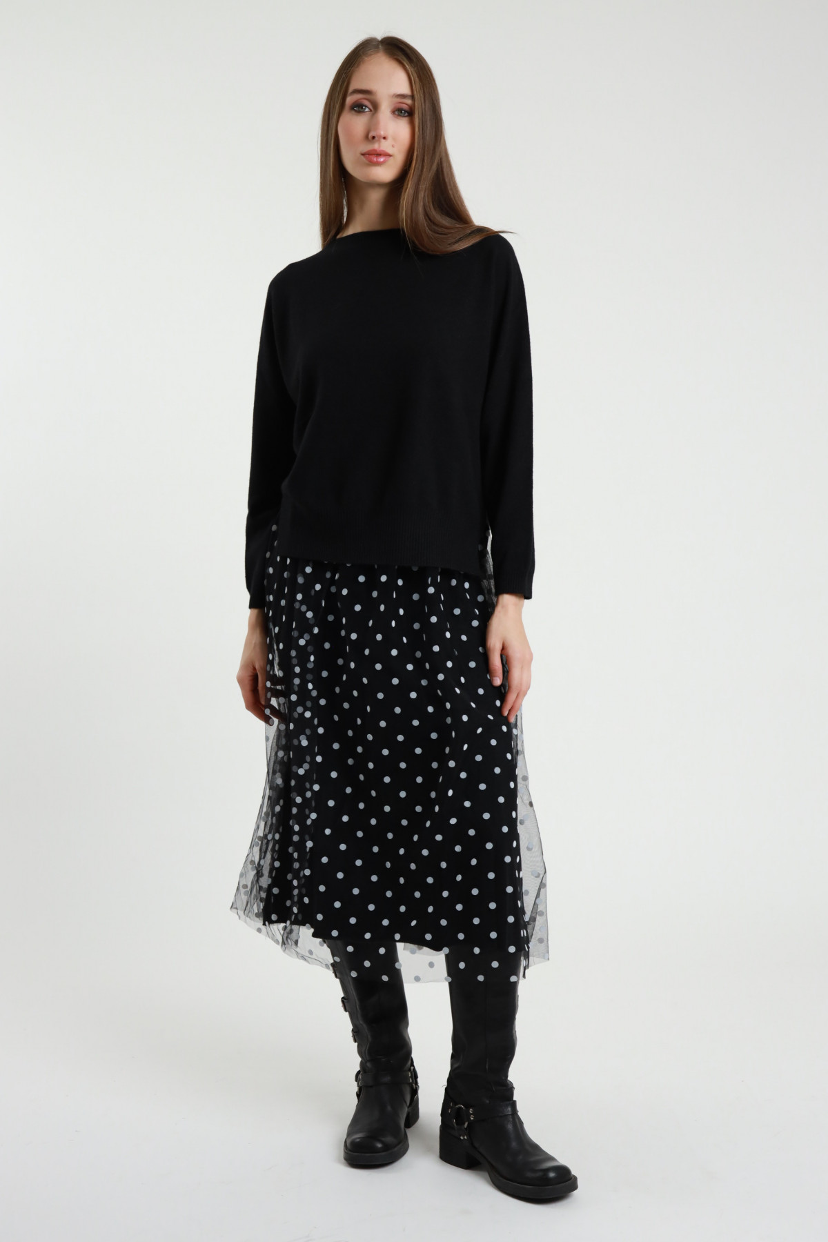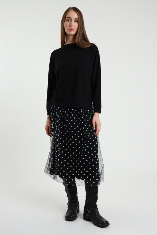 Long dress undernovations with adjustable narrow straps, with embroidery on the bottom and neckline, pied de poule fantasy. Removable culotte included in the dress. 100%PL