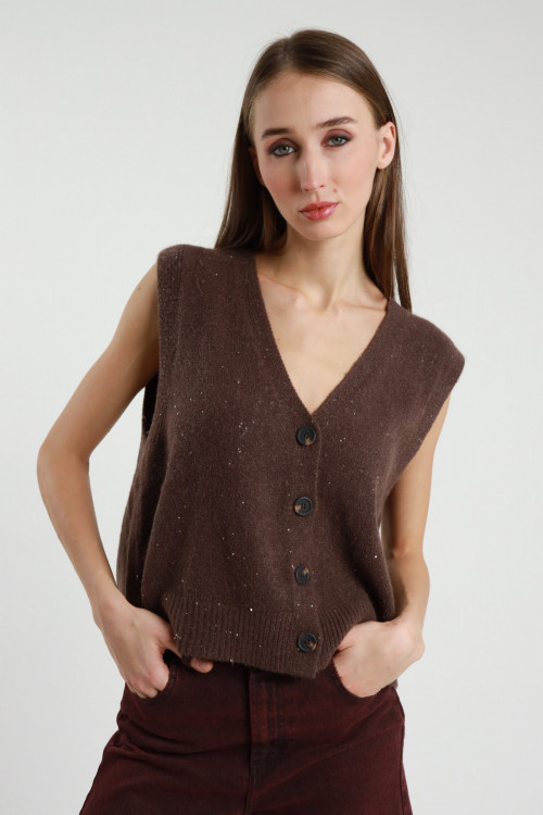 Gilet in Micro Paillettes con Scollo a V e Chiusura a Bottoni.