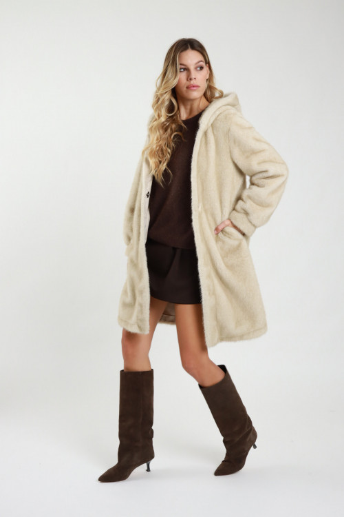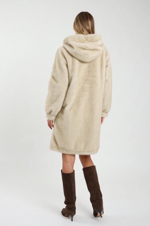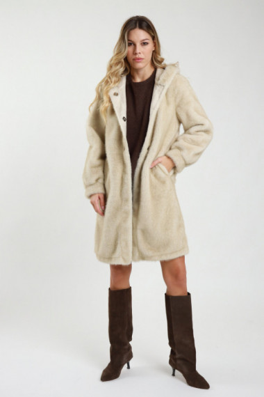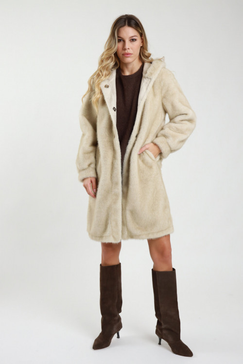 Ecopelliccia Over Lunga con Cappuccio, Tasche Laterali e Chiusura Bottoni.