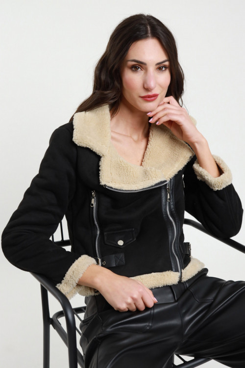 Giacca Corta Spinata con Collo in Ecopelliccia Removibile.
