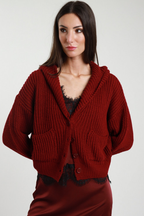 Cardigan Over in Maglia con Cappuccio e Tasche Laterali. Chiusura Bottoni.