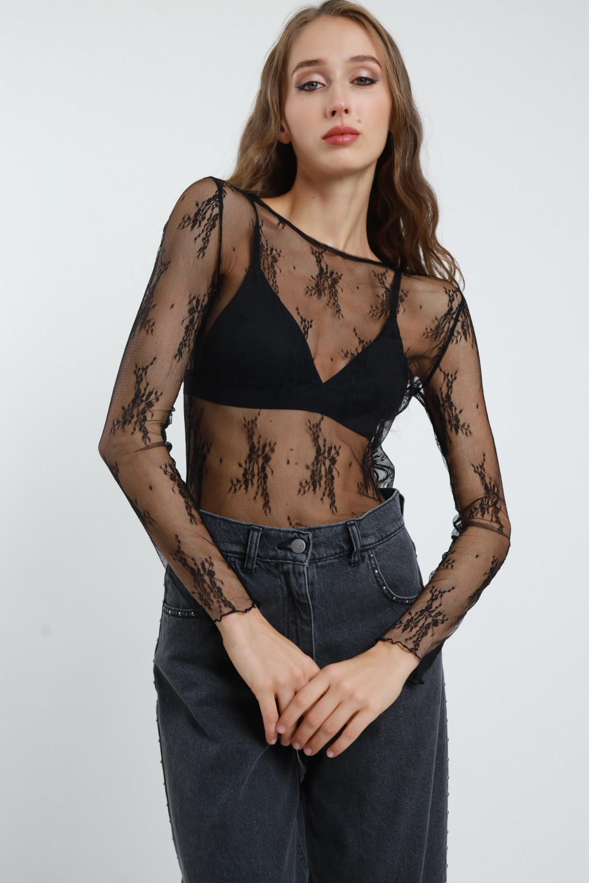 Maglia Girocollo in Pizzo a Maniche Lunghe.