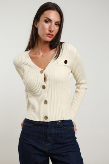 Cardigan Crop a Coste con Bottoni Gioiello, Finte Tasche a Filetto sul Fronte.