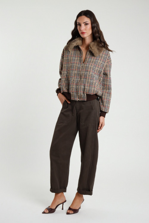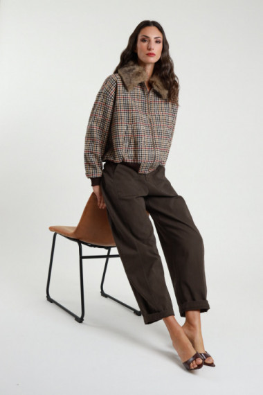Pantaloni in Fantasia Check con Pences e Bottone alla Caviglia.
