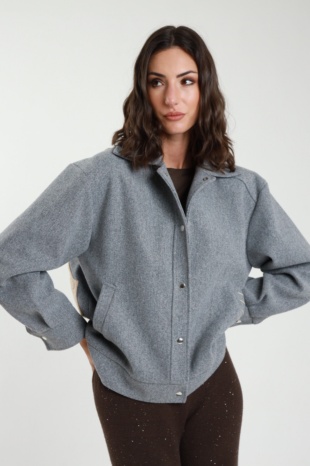 Bomber Panno con Scritta e Fantasia sul Retro. Chiusura a Bottoni a Clip e Tasche Laterali.