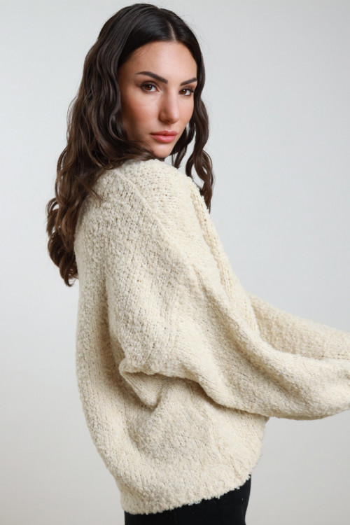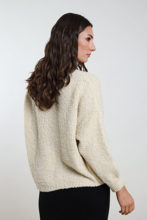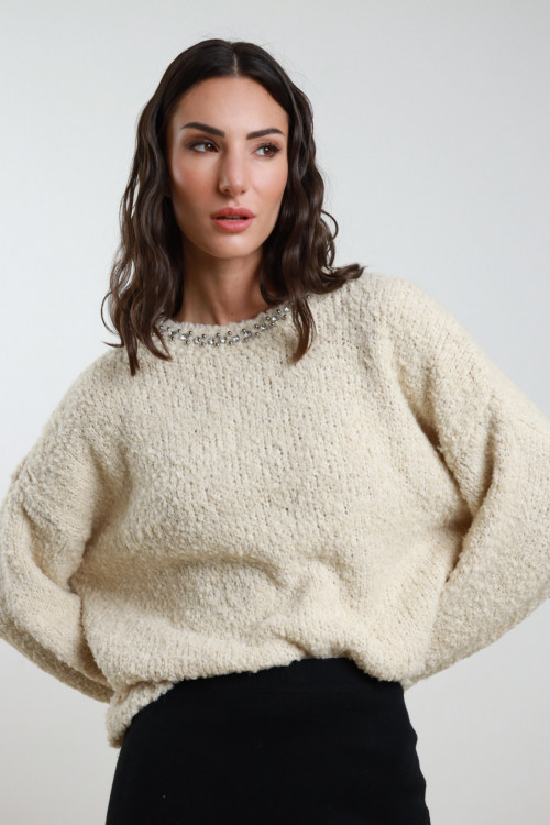 Maglione Over in Bouclè con Dettaglio Strass e Perle nel Girocollo.