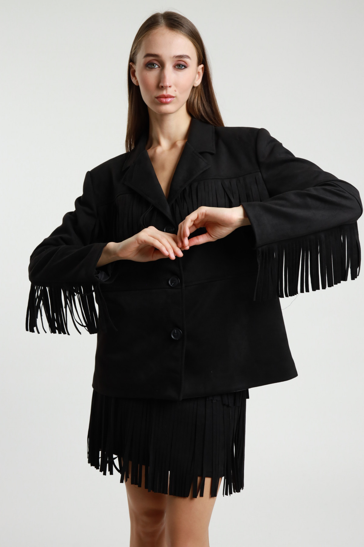 Giacca Over in Eco Dainetto con Dettaglio Frange, Chiusura Doppio Bottone.