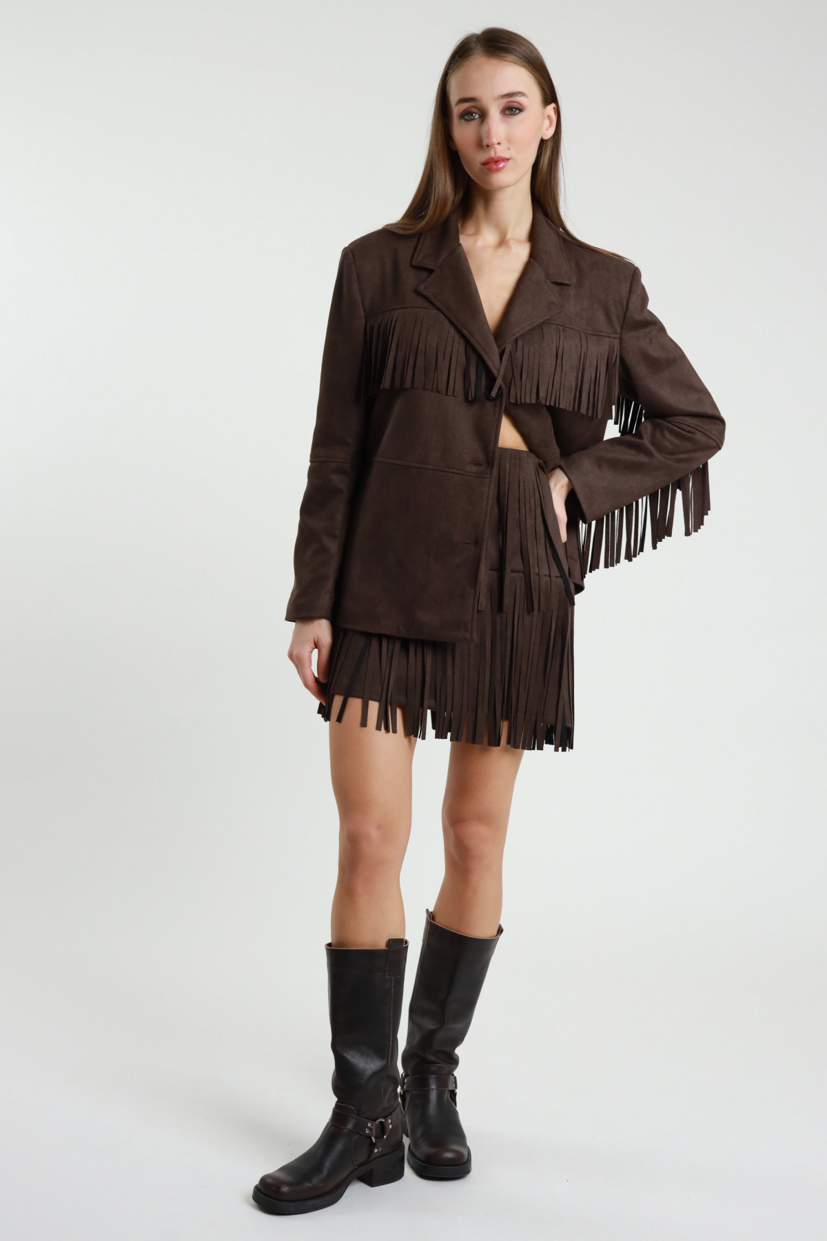 Giacca Over in Eco Dainetto con Dettaglio Frange, Chiusura Doppio Bottone.