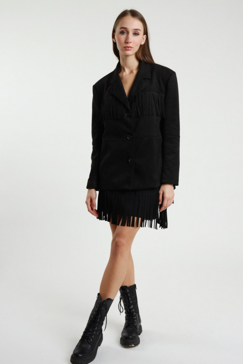 Giacca Over in Eco Dainetto con Dettaglio Frange, Chiusura Doppio Bottone.