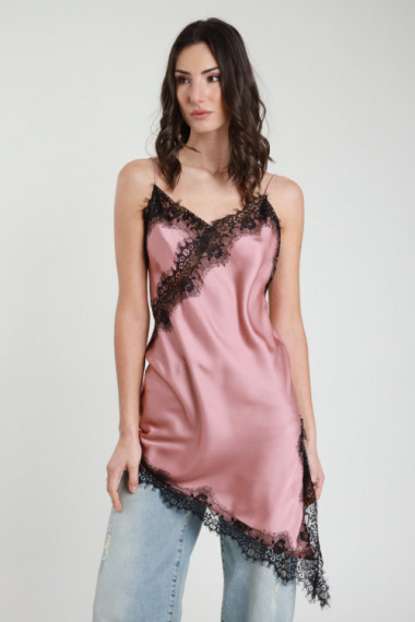 Top Satinato in Pizzo con Scollo a V e Spalline Sottili. Fondo Lungo Asimmetrico.