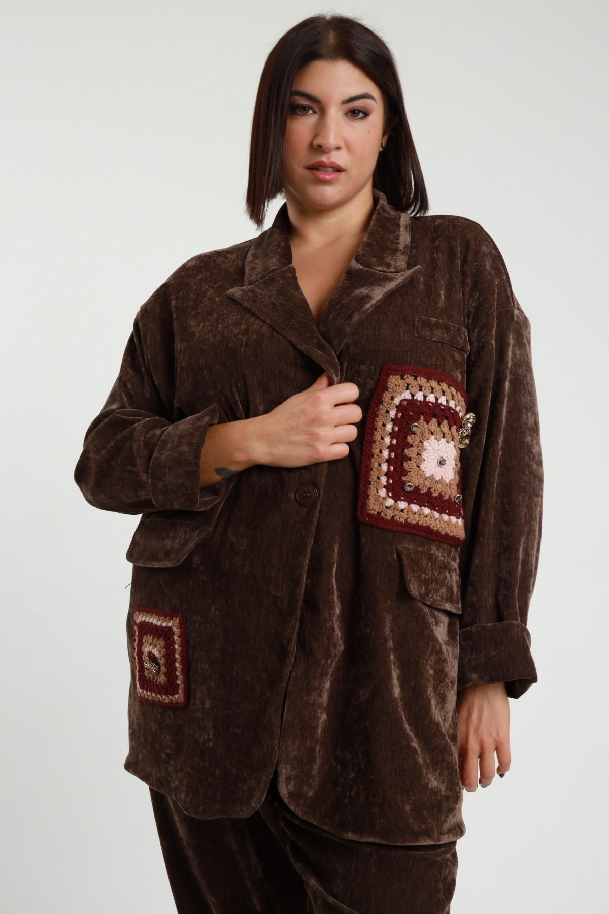 Oversized jacket with crochet patch, single-button closure and front welt pockets with flap - Curvy Susy Star line. 60%pl 20%vi 20%pc+100%pl