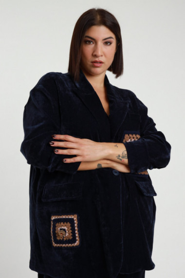 Oversized jacket with crochet patch, single-button closure and front welt pockets with flap - Curvy Susy Star line. 60%pl 20%vi 20%pc+100%pl