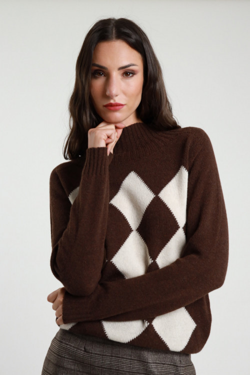 Maglione Collo Cratere con Fantasia Rombi e Orli a Costine.