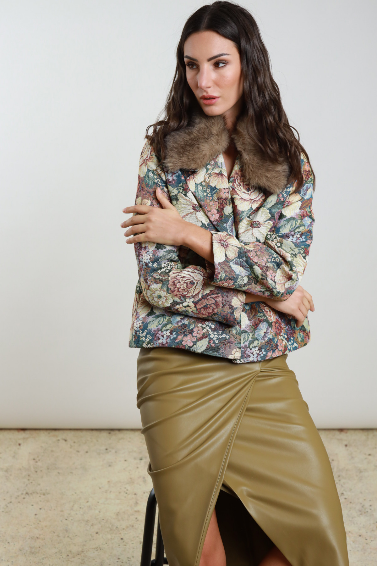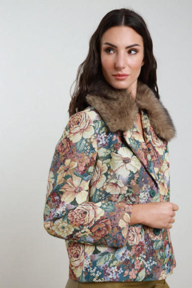 Giacca Jaquard con Colletto in Ecopelliccia, Rever Classico e Chiusura a Bottoni.