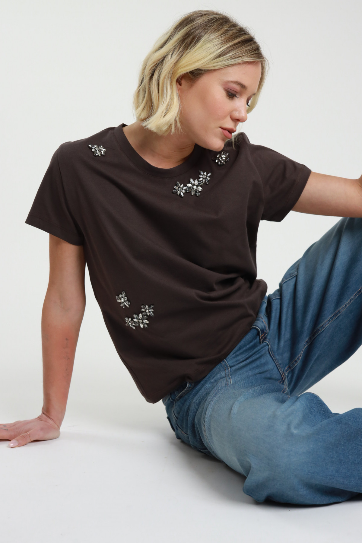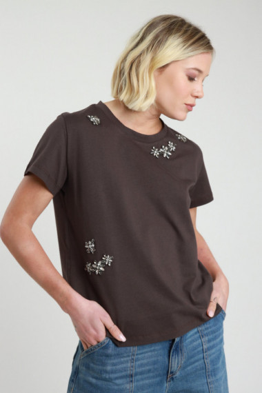 T-Shirt in Cotone Mezze Maniche con Applicazioni Gioiello Strass.