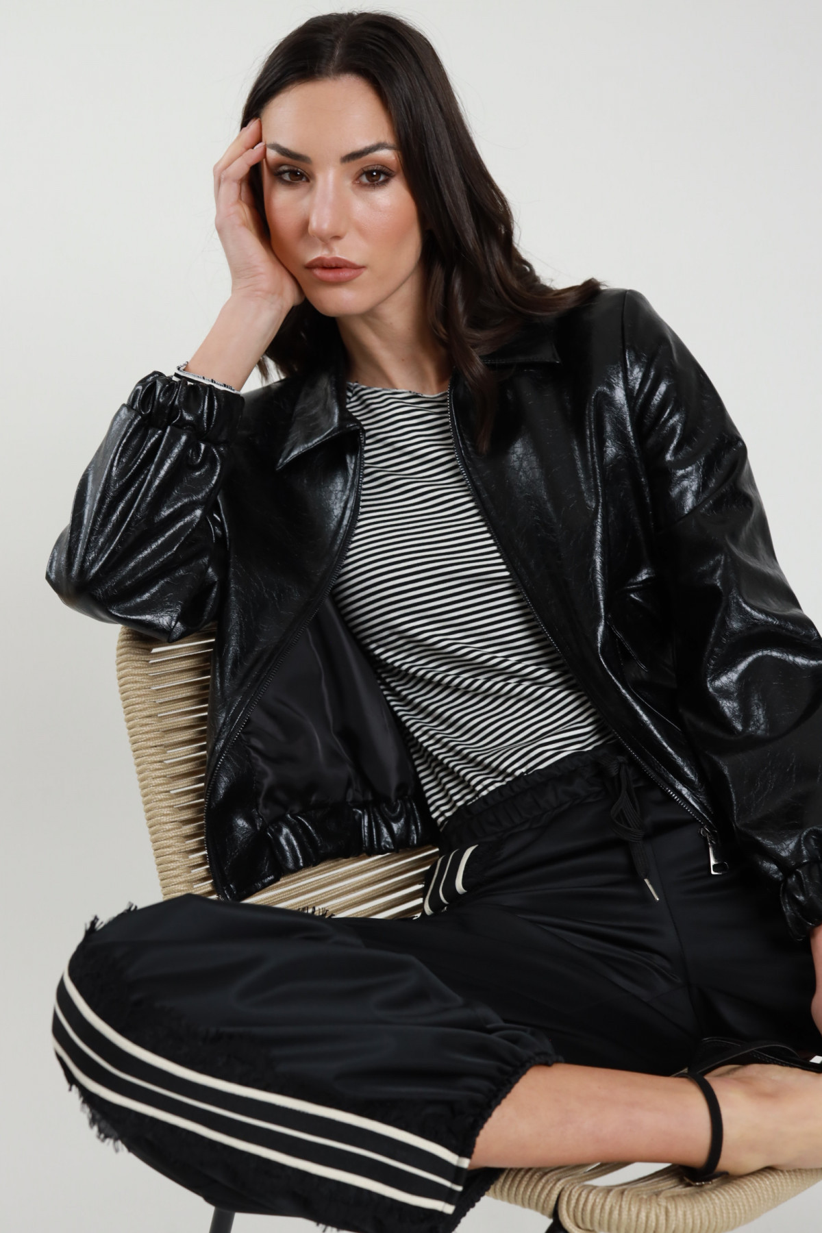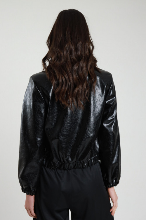 Bomber Crop in Ecopelle Lucida con Colletto a Camicia, Tasche Frontali Applicate e Chiusura Zip.