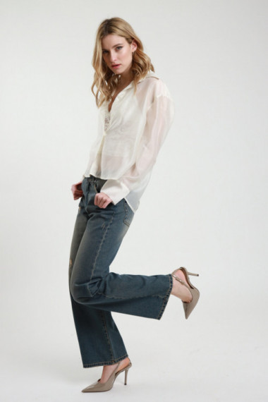 Straight leg jeans in sandblasted wash with tears, zip and button closure, 4 pockets. 100% co
