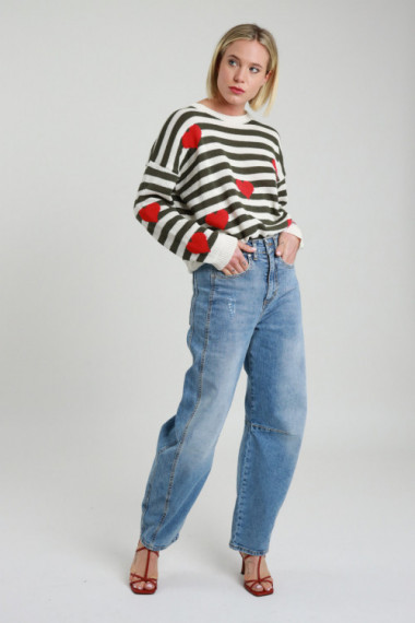 Maglia Girocollo A Righe e Con Cuori, Spalla Scesa, Fit Leggermente Over.