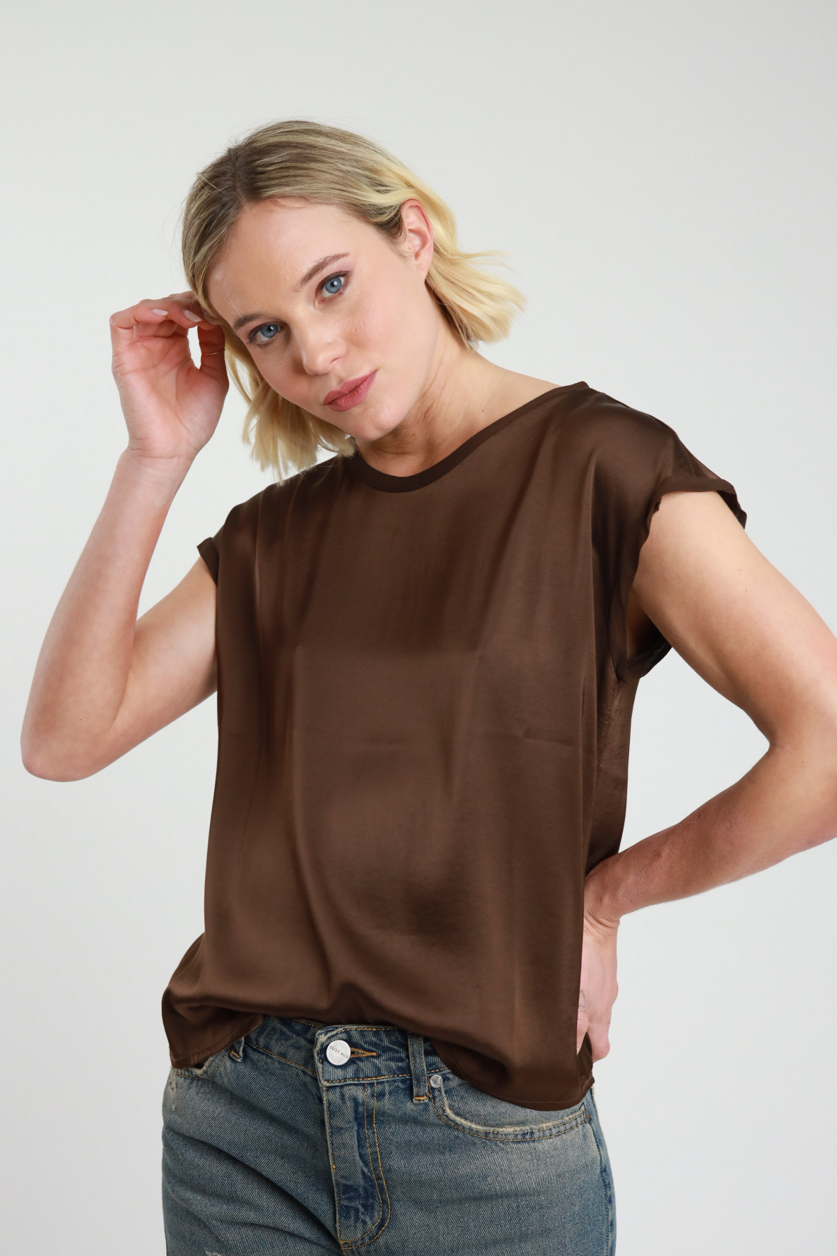 T-Shirt Mezze Maniche Stretch in Viscosa Elasticizzata con Bordi in Georgette.