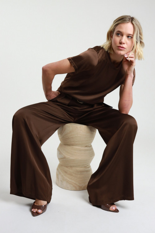 Pantalone a Palazzo con Pences in Viscosa Effetto Raso, Elastico e Cintura in Vita con Passanti, 2 Tasche.