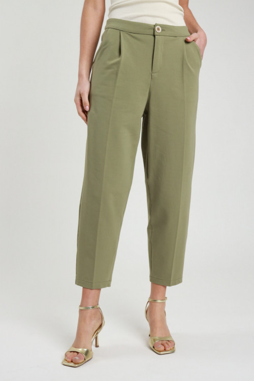 Pantalone Gamba Dritta in Felpa Elasticizzata con Pences, 2 Tasche, Chiusura Zip e Bottone.