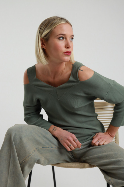 Maglia in Viscosa, Scollo V con Cut Out sulle Spalle. 65%vi 35%pa