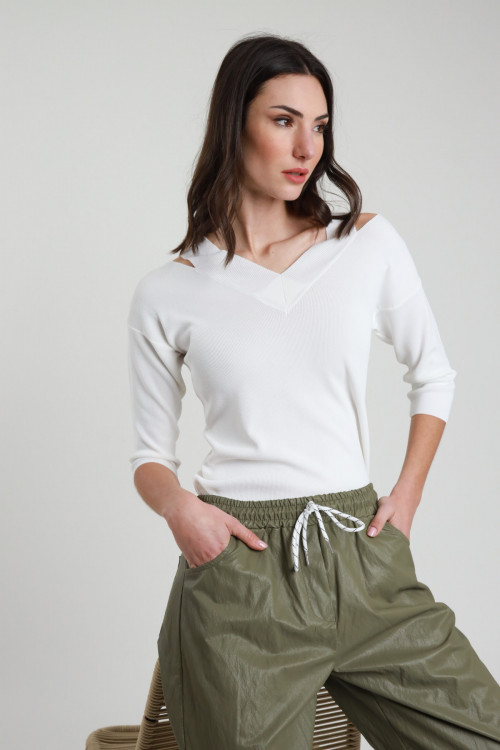 Maglia in Viscosa, Scollo V con Cut Out sulle Spalle. 65%vi 35%pa