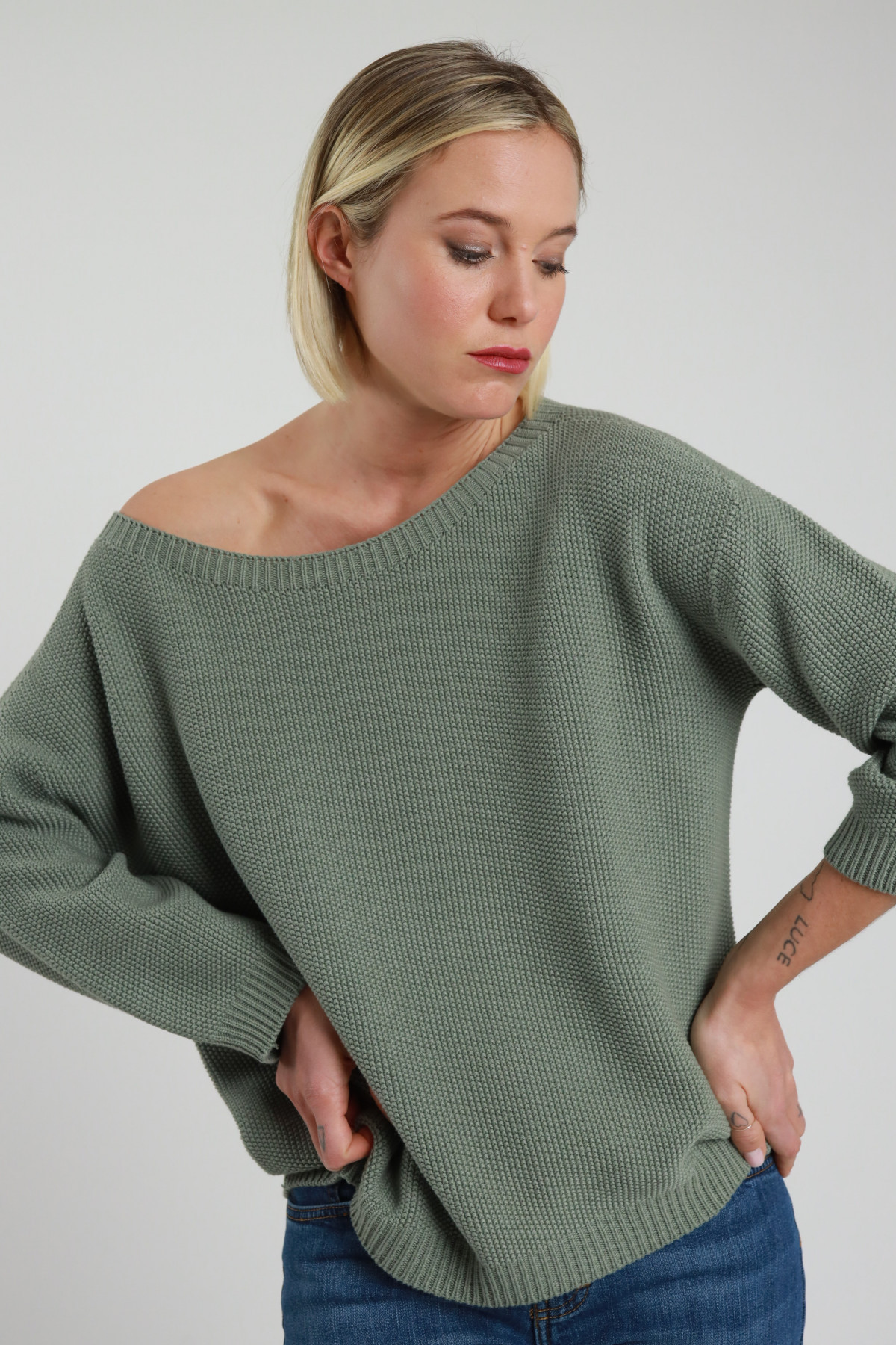Maglia in Cotone Punto Riso Manica 3/4, Scollo Barchetta.