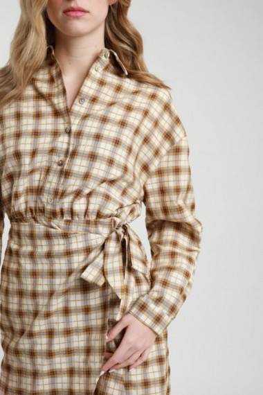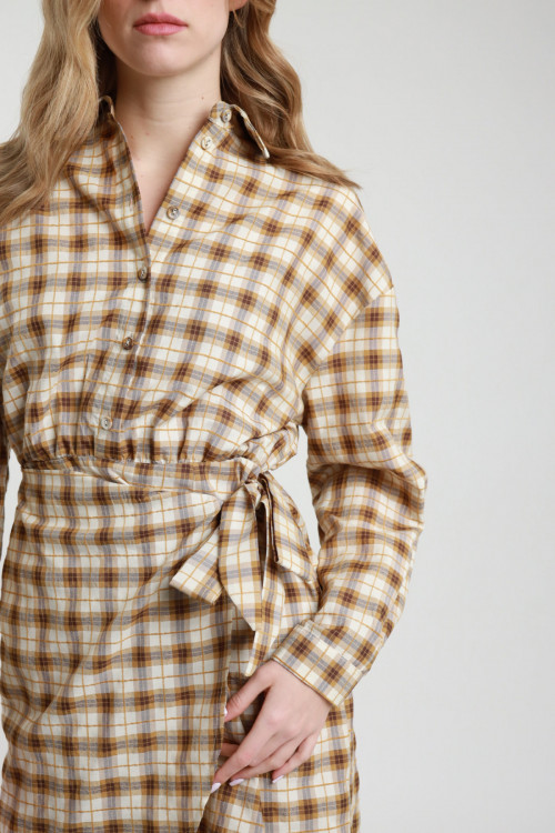 Mini Abito Corto in Fantasia Check: Camicia Sopra e Gonna a Portafoglio Sotto. Elastico in Vita sul Retro.