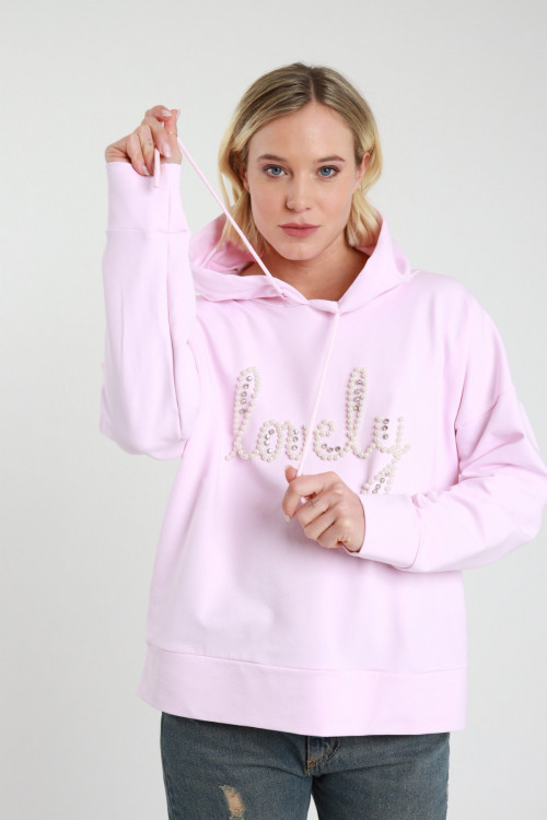 Felpa in Cotone con Cappuccio e Applicazione Perle e Strass "Lovely".