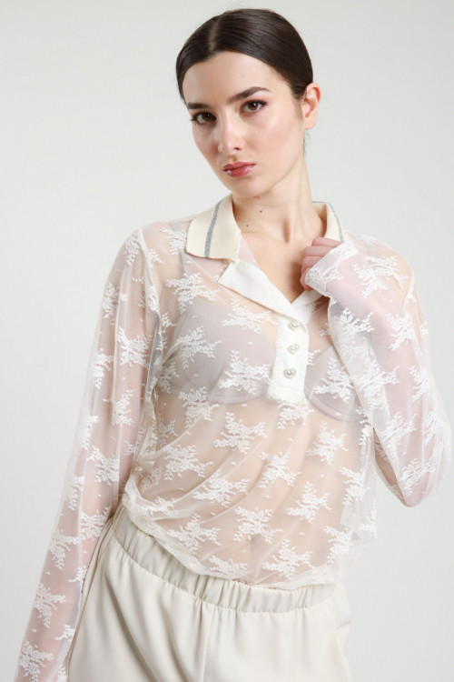 Polo in Pizzo con Bottoni Gioiello e Riga in Lurex sul Colletto.