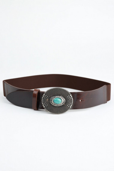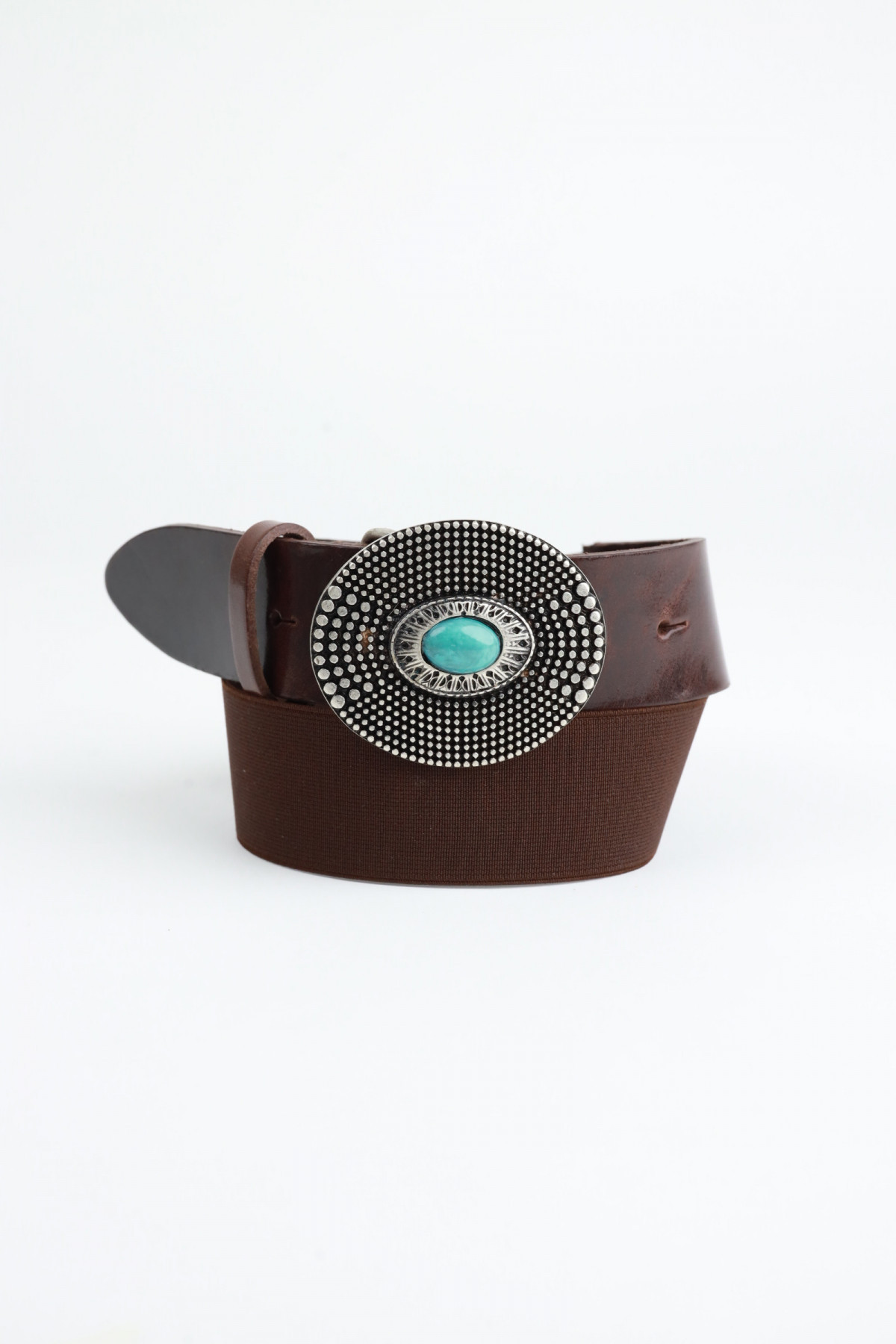 Cintura in Pelle con Elastico e Fibbia in Stile Western con Perla Turchese.