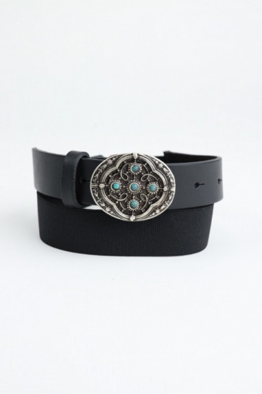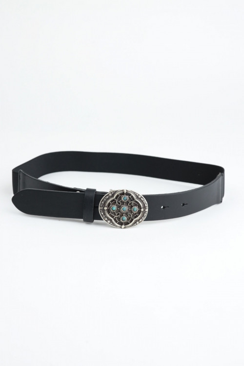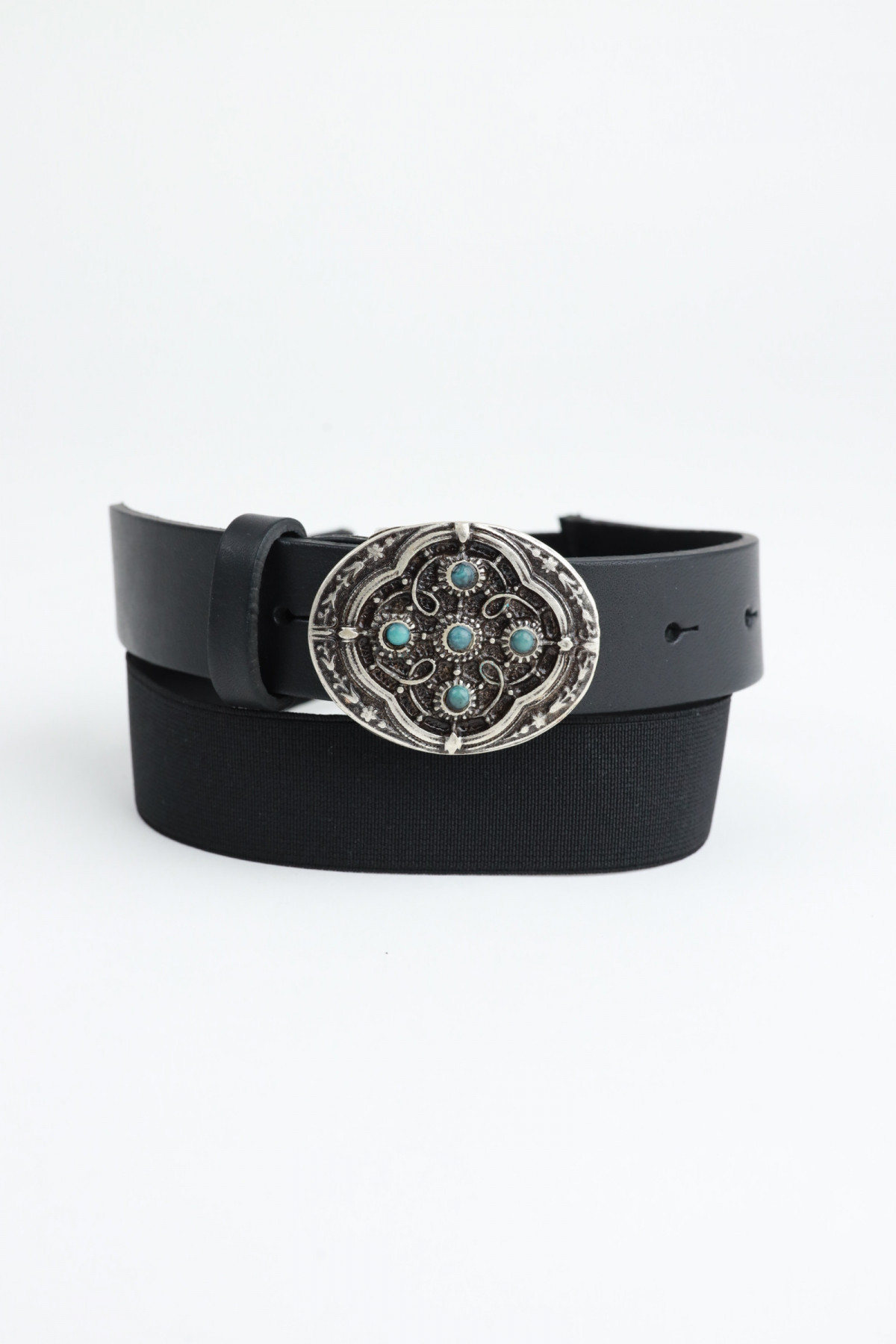 Cintura in Pelle con Elastico e Fibbia Stile Western con Perle Turchesi.
