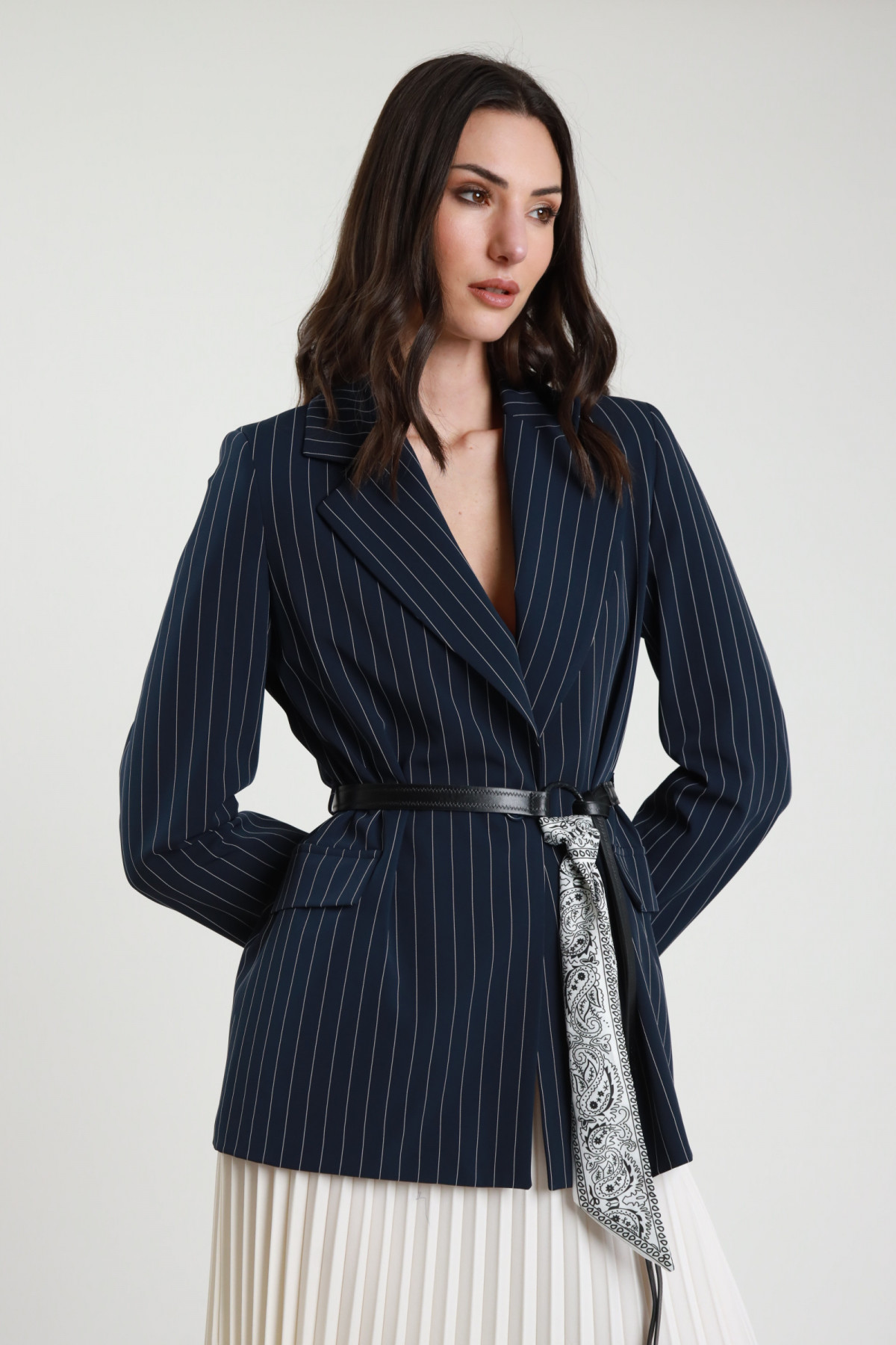 Giacca Gessata con Cintura in Vita e Foulard.