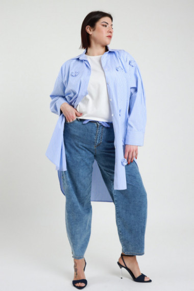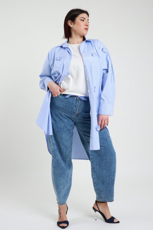 Camicia Over Lunga Gessata con Fiori Applicati - Linea Curvy Susy Star.