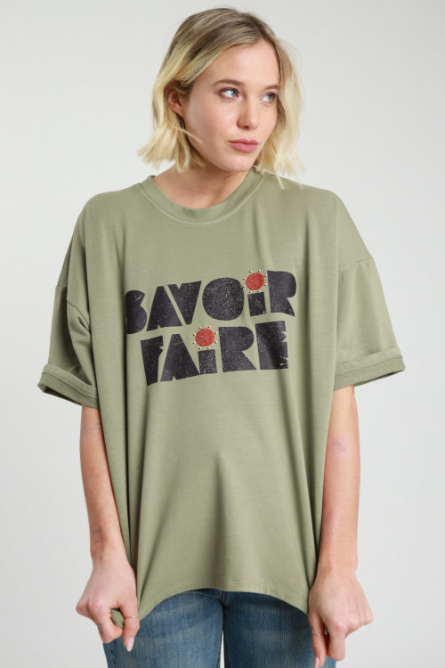 Felpa Over Maniche Corte con Stampa "Savoir Faire" sul Fronte e Borchiette.