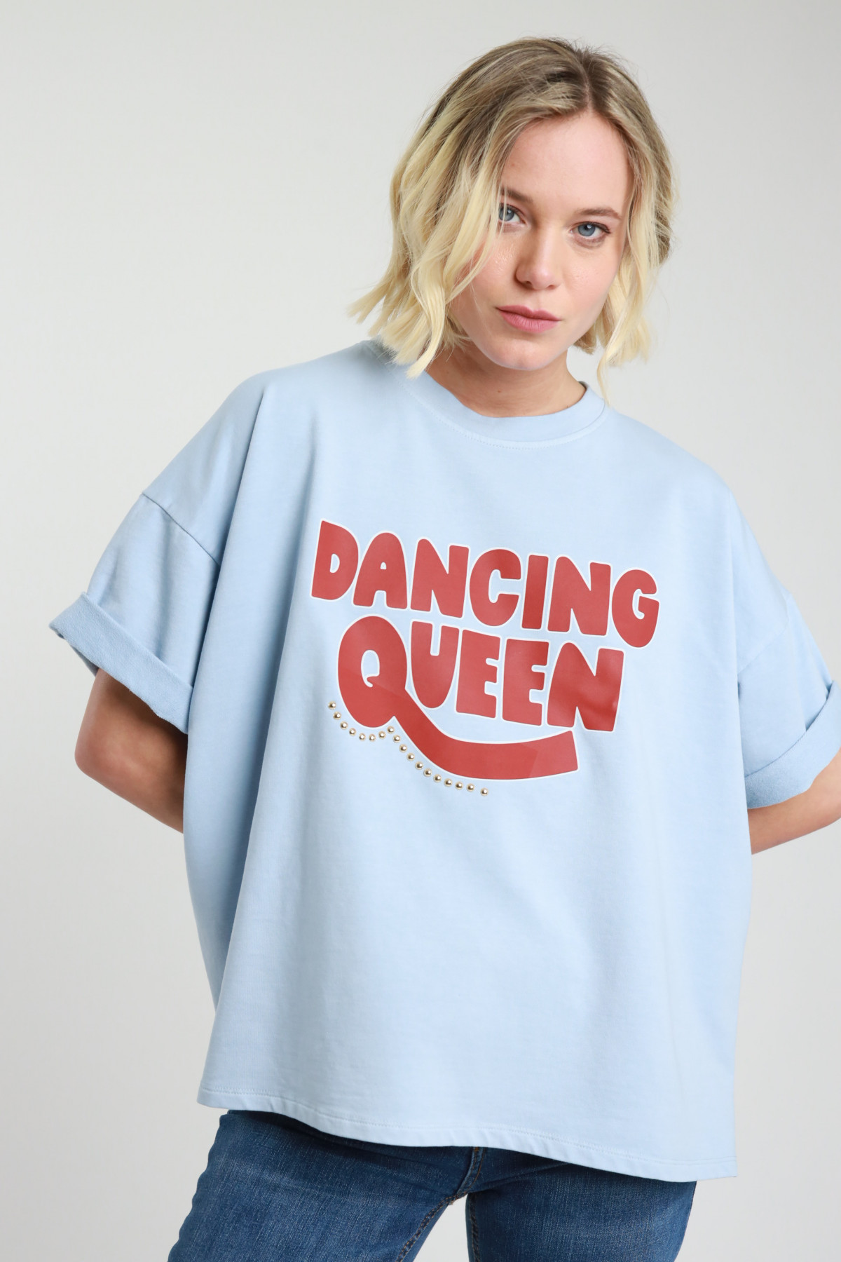 Felpa Girocollo Maniche Corte con Stampa e Borchiette Applicate.