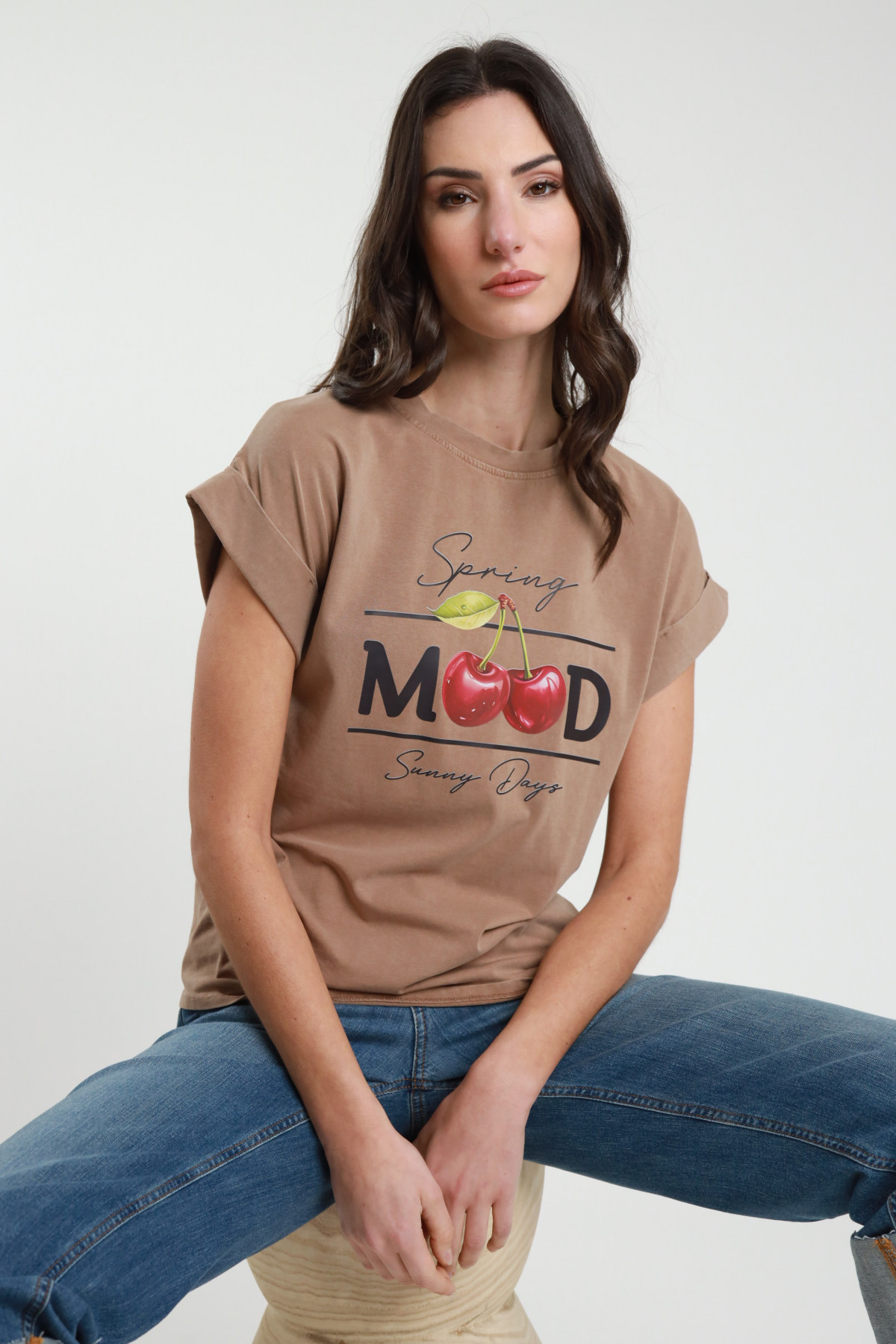 T-Shirt Girocollo Maniche Corte Marmorizzata con Stampa sul Fronte.