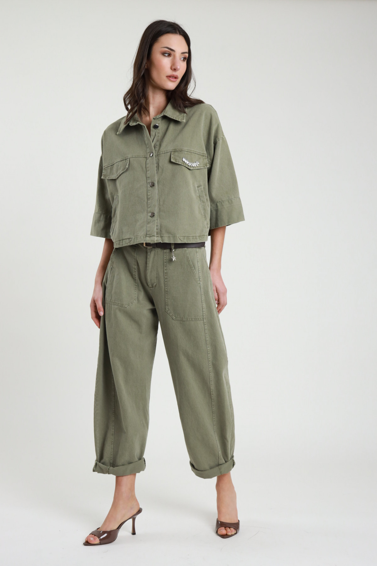 Pantalone Stellina in Cotone Bull Denim, Modello Baloon con Tasconi, Cintura in Vita e Ciondolo Stellina.