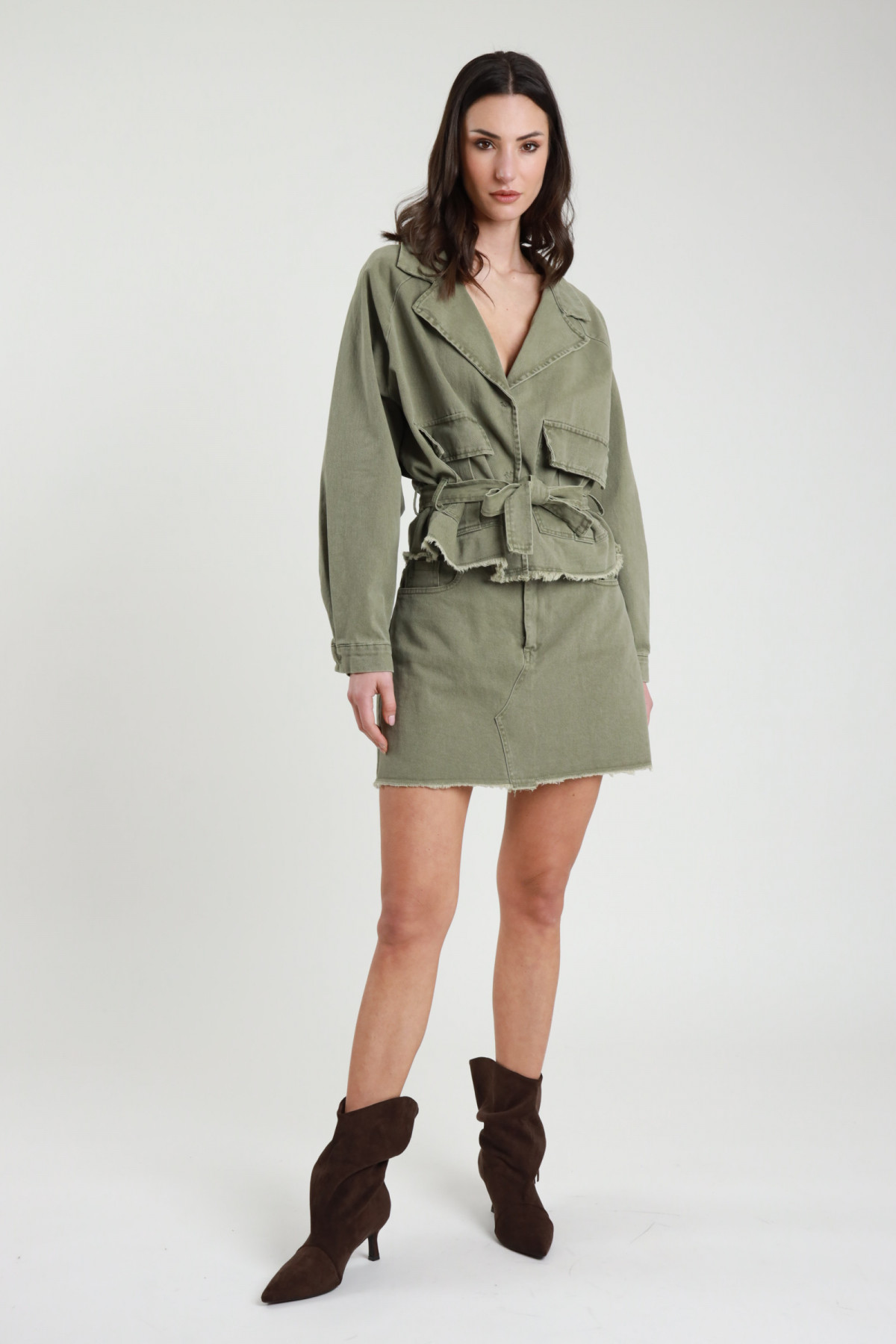 Minigonna in Bull Denim con Cintura in Vita, Sfrangiata sul Fondo.