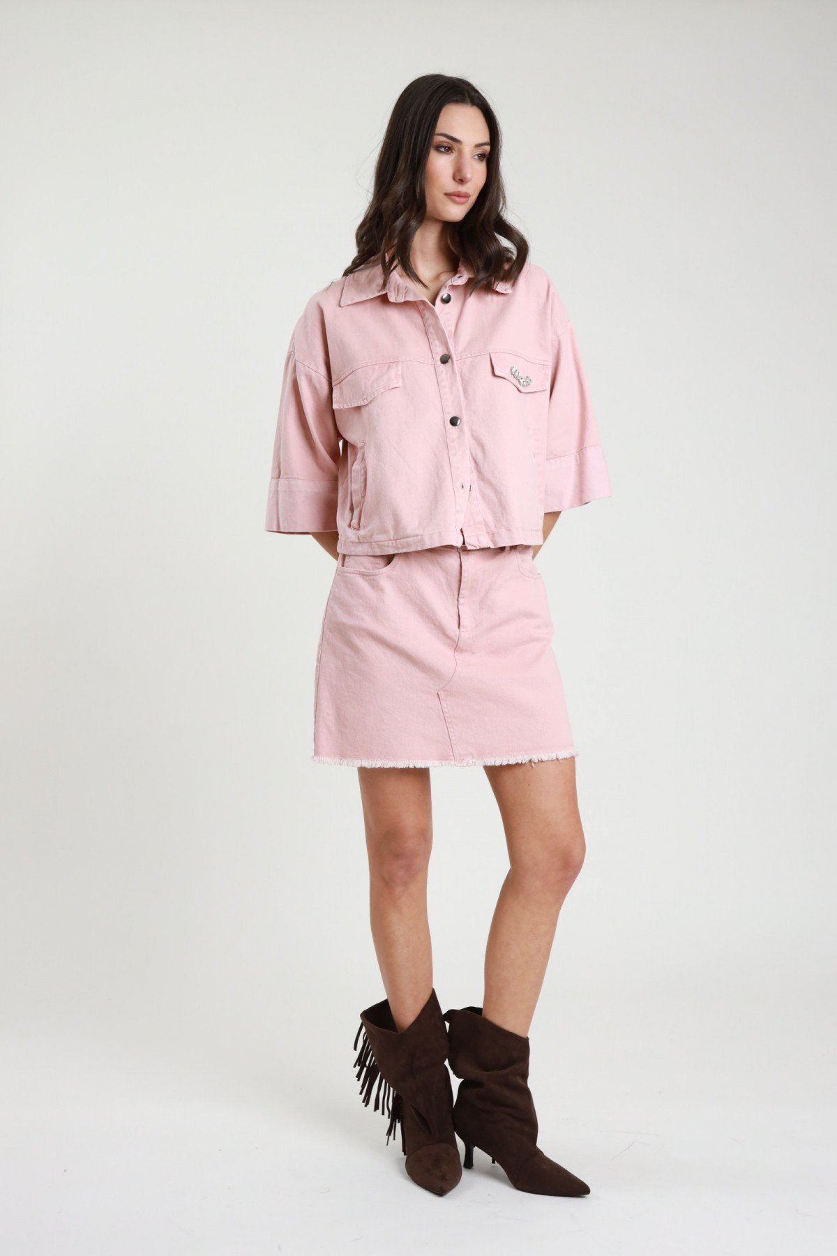 Minigonna in Bull Denim con Cintura in Vita, Sfrangiata sul Fondo.