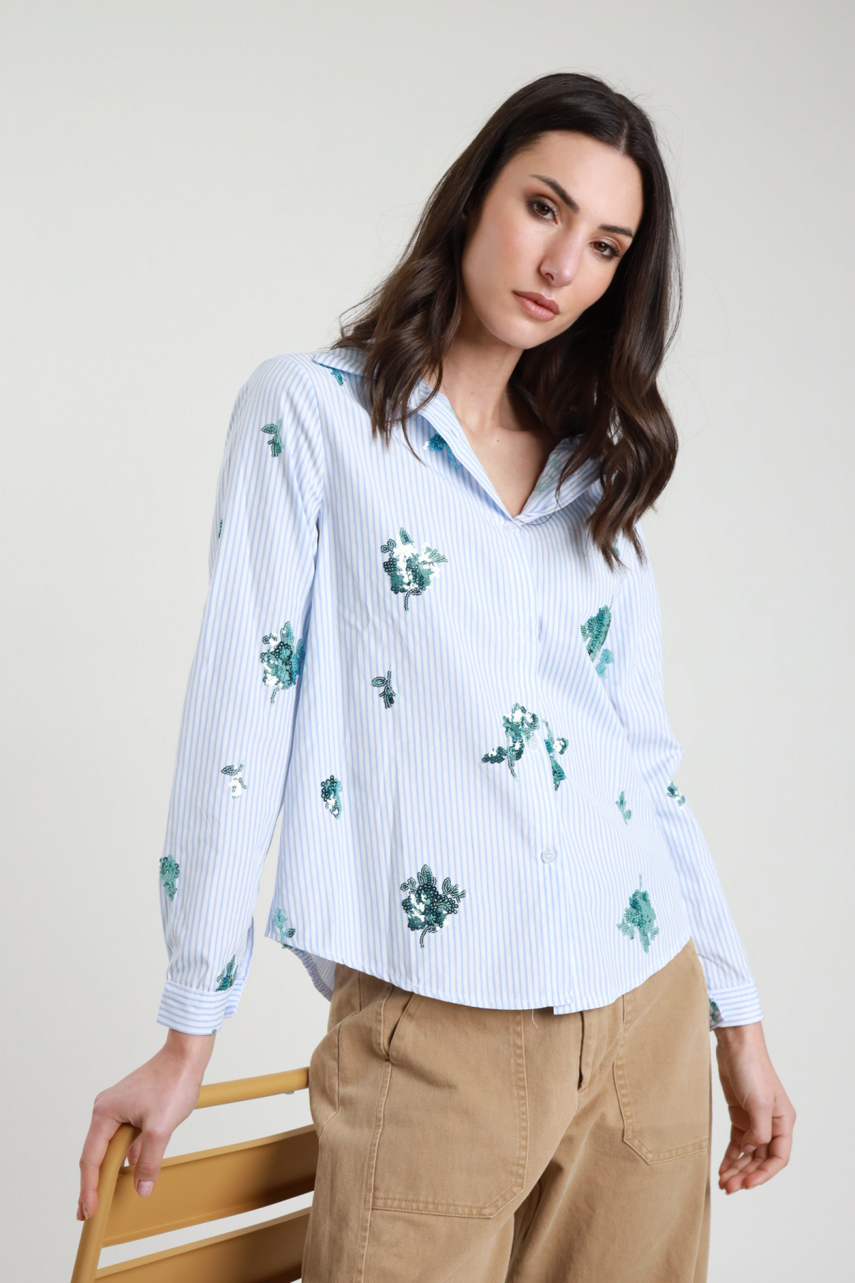 Camicia Gessata a Righe con Dettaglio Fiori in Pailettes. 50%co 50%pl