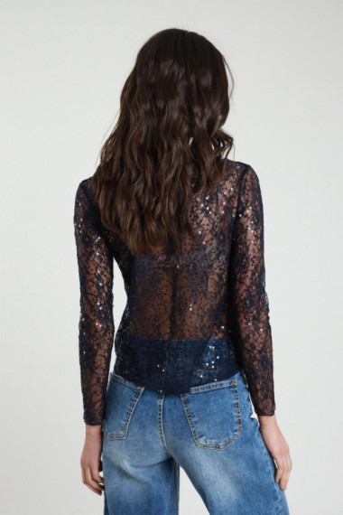 T-Shirt Girocollo Maniche Lunghe in Pizzo con Paillettes.