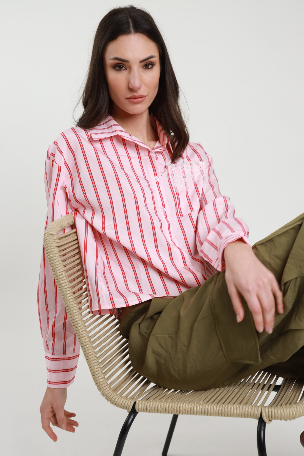 Camicia Gessata con Taschino Applicato con Dettaglio Pizzo.