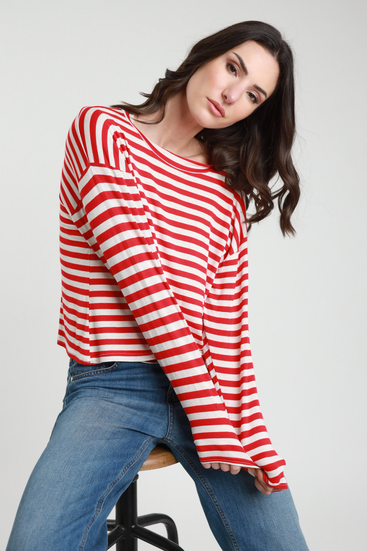 T-shirt Over Elasticizzata Girocollo Maniche Lunghe a Righe.