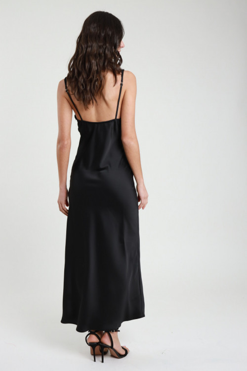 Abito Lungo in Raso con Scollo in Pizzo e Imbottitura sul Seno.