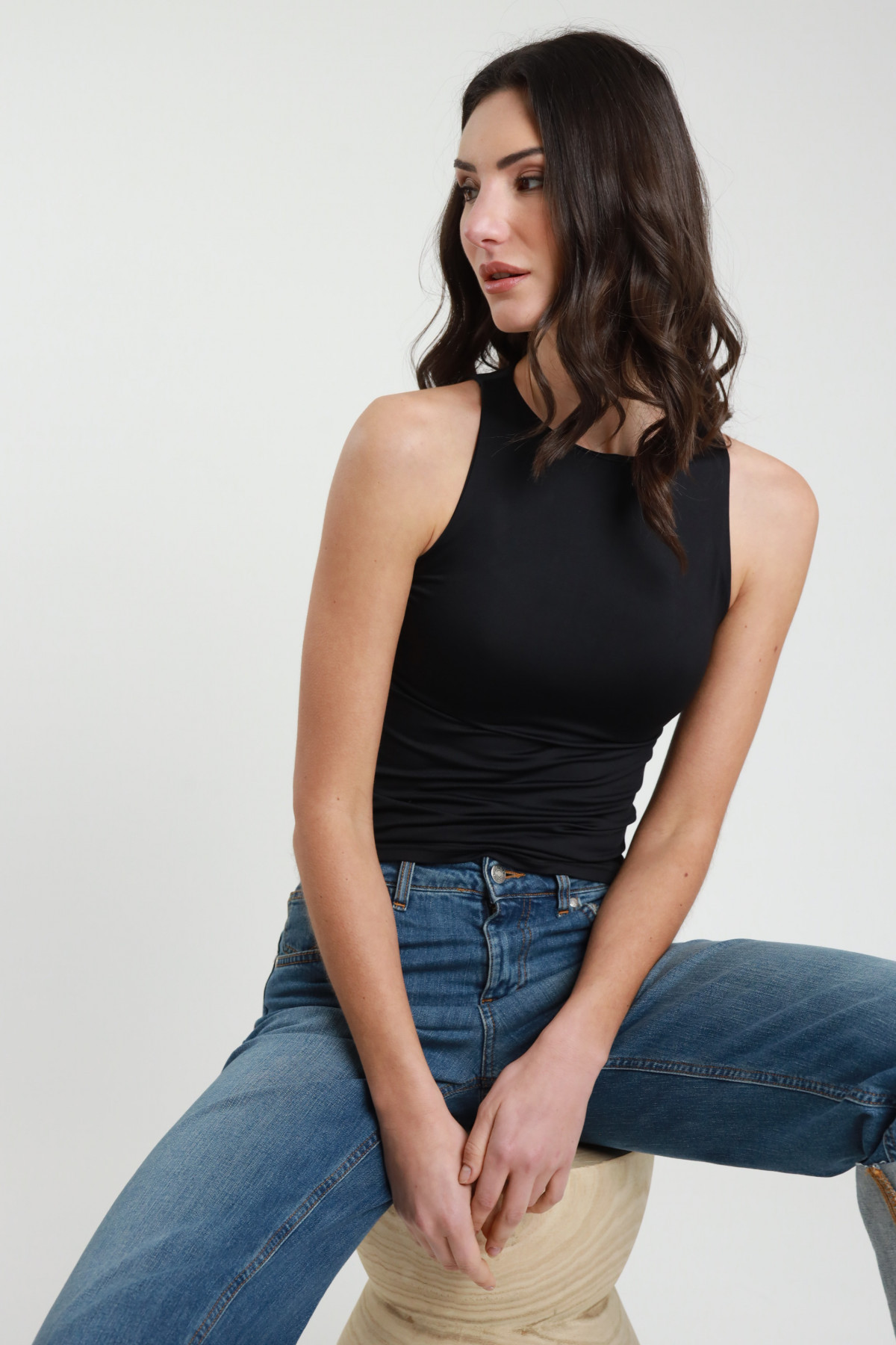 Canotta Canettata Con Scollo Tondo e Spalline Strette, Strass Apllicati.