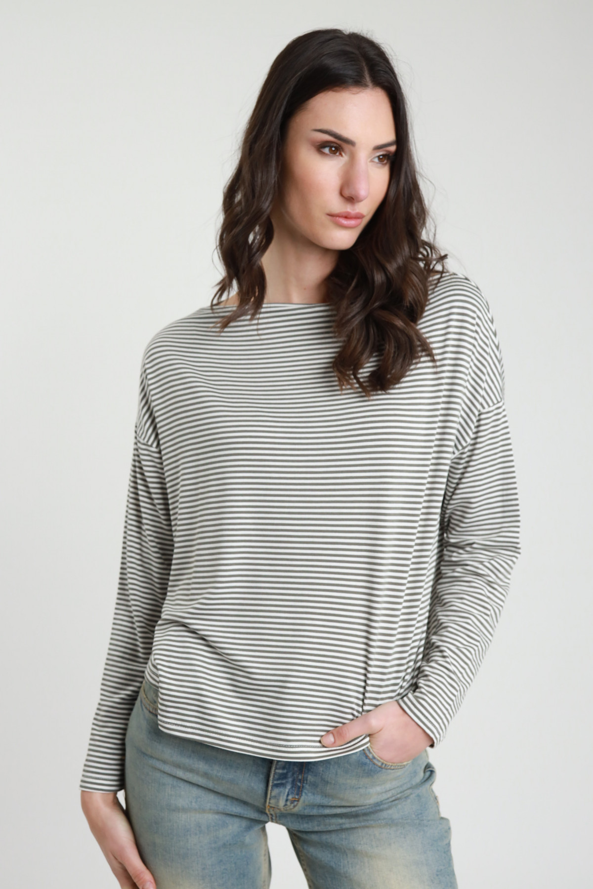 T-shirt Elasticizzata Maniche Lunghe con Scollo Barchetta a Righe.