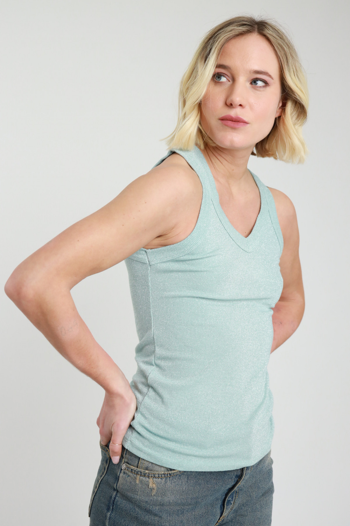 Canotta Canettata Con Scollo Tondo e Spalline Strette, Strass Apllicati.