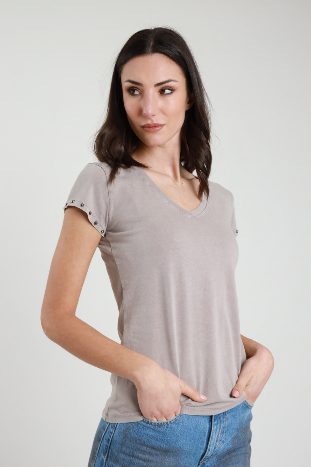 T-Shirt in Cotone Elasticizzato Effetto Slavato con Scollo a V e Borchie nel Giromanica.